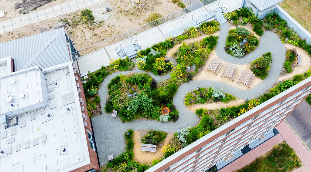 Van de constructieve basis tot de zichtbare afwerking – ons vakmanschap zie je in alle lagen van het gebouw. Blikvanger vanuit de lucht is de ruime daktuin op de 7e verdieping. Deze groene oase biedt bewoners een plek om samen te komen en voegt extra leefkwaliteit toe aan het wooncomplex.